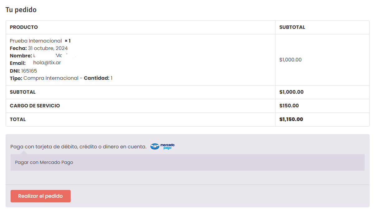 Si elije MercadoPago será dirigido a otra pantalla en donde verá los datos del pedido y al hacer click en “Realizar el pedido” será dirigido a MercadoPago para completar la transacción.