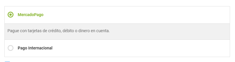 Si el productor admite pago internacionales, verá las opciones para elegir o MercadoPago o Pago Internacional.