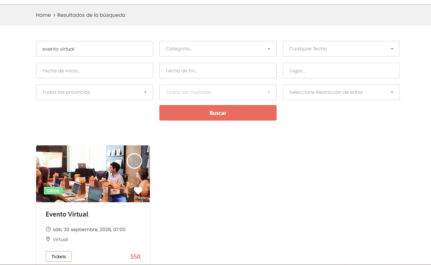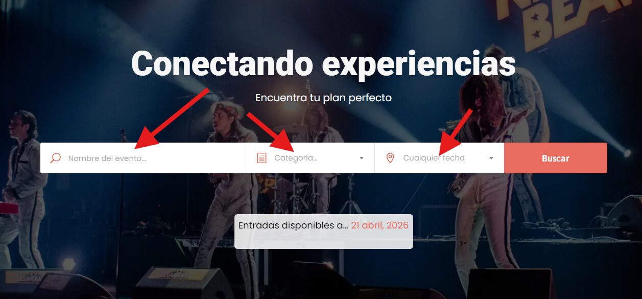 El primer paso es encontrar el evento en el que se quiere comprar las entradas. Esto se puede hacer desde el buscador principal, escribiendo el nombre del evento, o seleccionando una categoría, o una fecha, o una combinación de todos. Luego al darle al botón buscar serás llevado a una página con los resultados de la búsqueda: