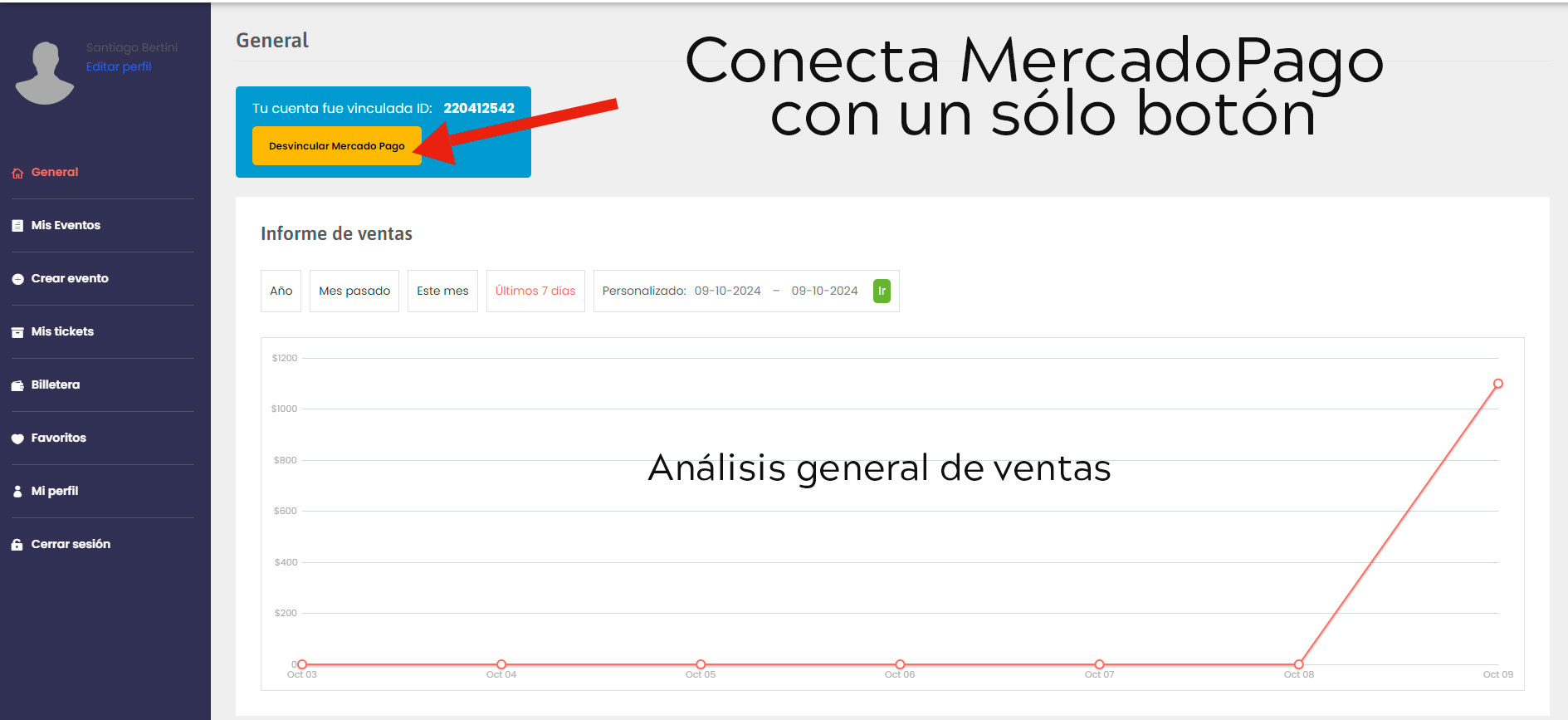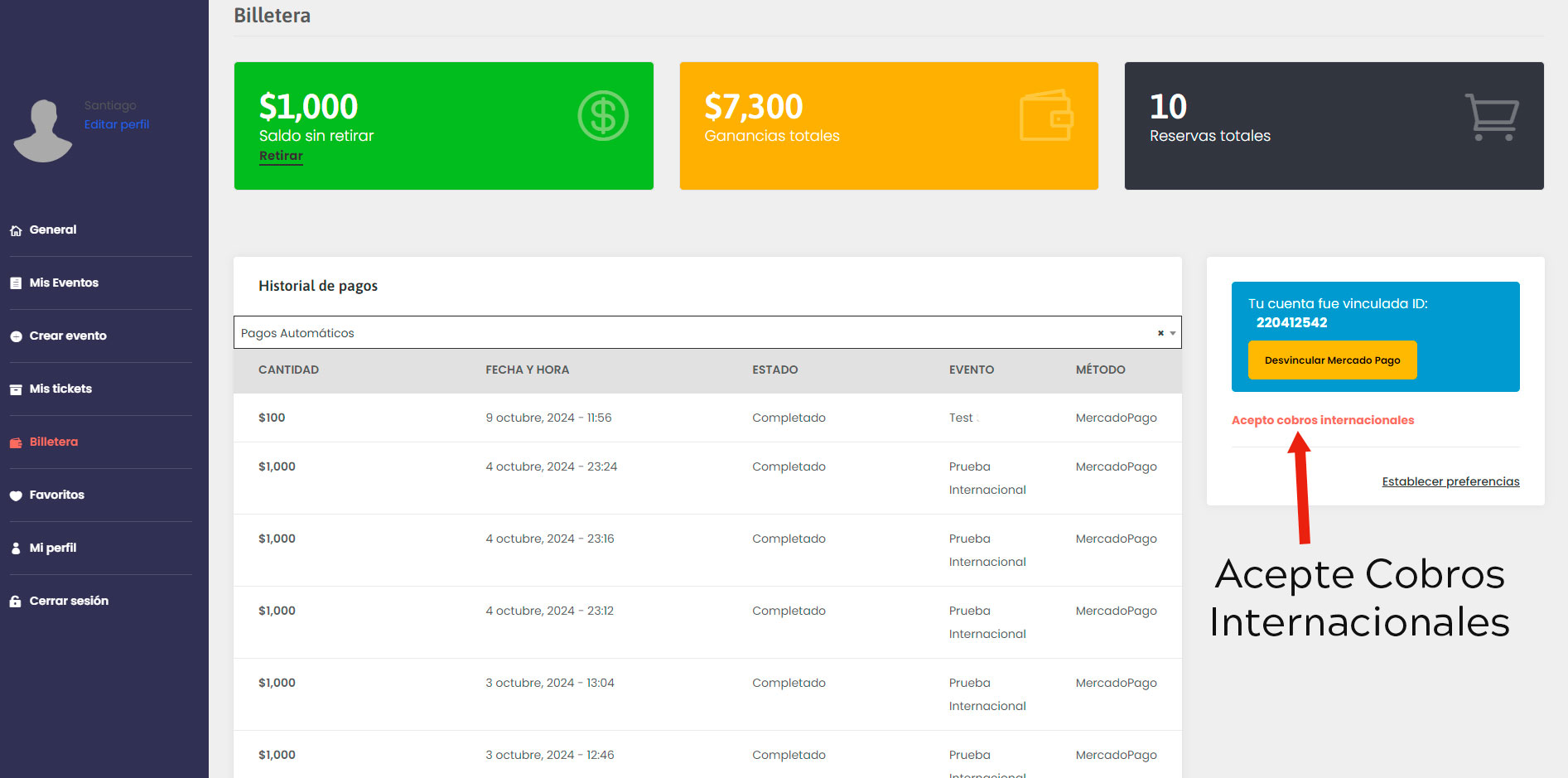 Cada vez que se compra una entrada, el pago ingresa directamente a la cuenta de MercadoPago del productor/organizador.