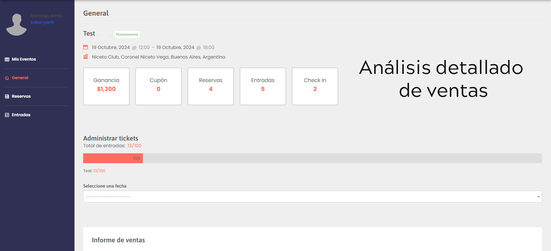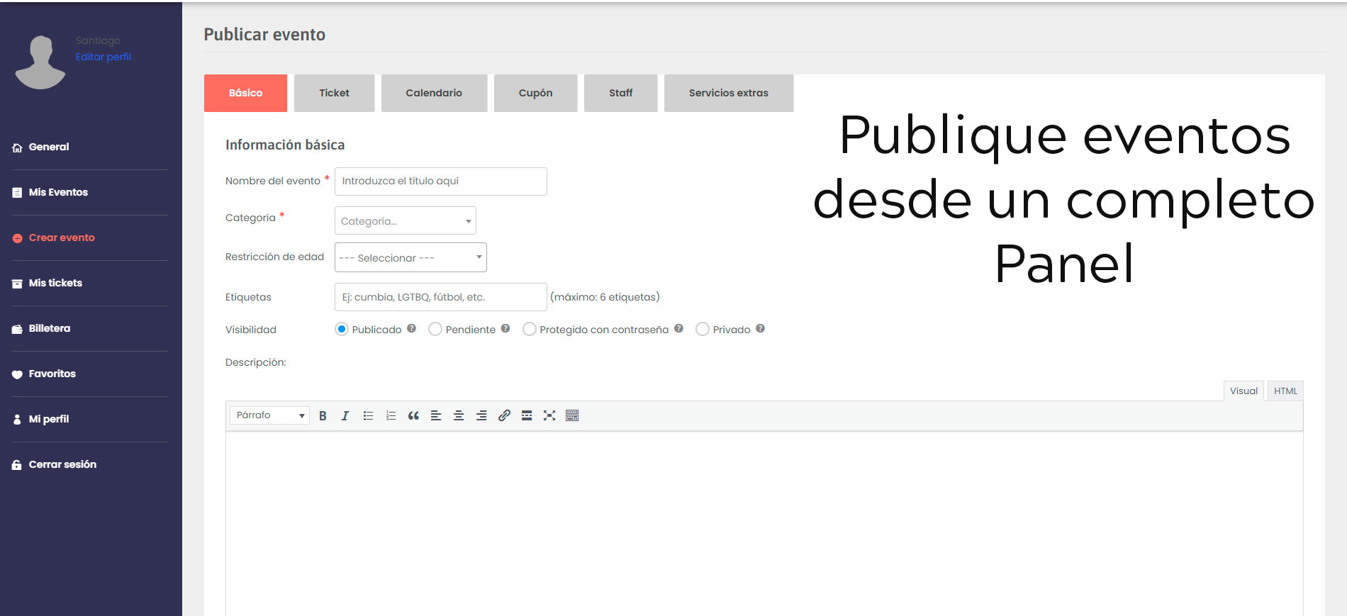 El organizador/productor publica el evento fácilmente y en pocos pasos en nuestra plataforma.