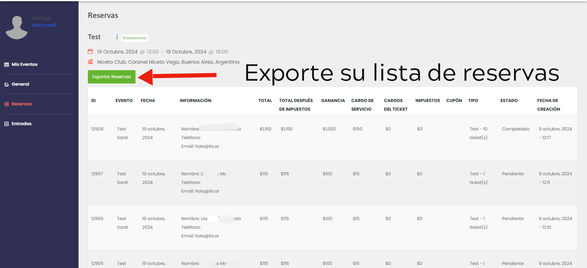 Accede a informes detallados con los datos de tus clientes. Nombre, e-mail, teléfono, etc.